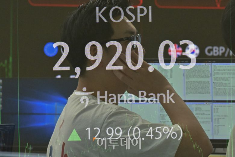 코스피가 7거래일 연속 상승 마감하며 2920선으로 마감한 12일 서울 중구 하나은행 딜링룸 전광판에 코스피가 표시돼 있다. 이날 코스피 지수는 전 거래일보다 12.99(0.45%)포인트 상승한 2920.03을 나타냈다. (다중노출 촬영) 조현호 기자 hyunho@ |
