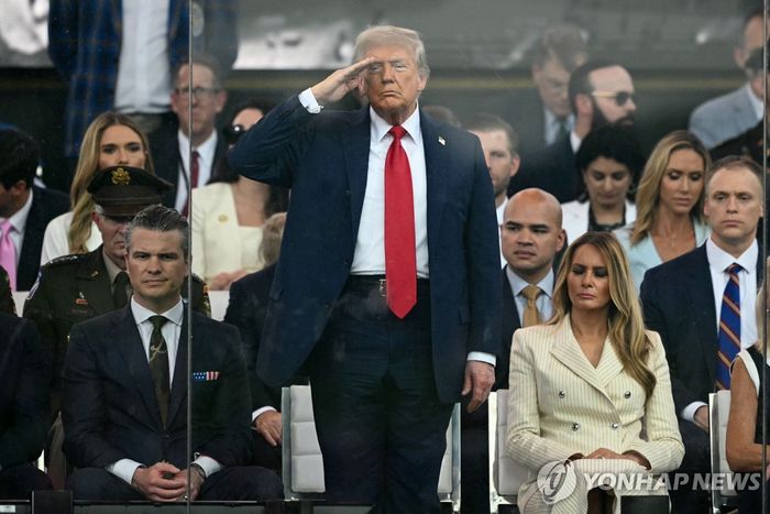 도널드 트럼프 미국 대통령이 14일(현지시간) 워싱턴DC에서 열린 미 육군 창설 250주년 기념 열병식에서 행진하는 군사들의 경례를 받고 있다. [연합뉴스]