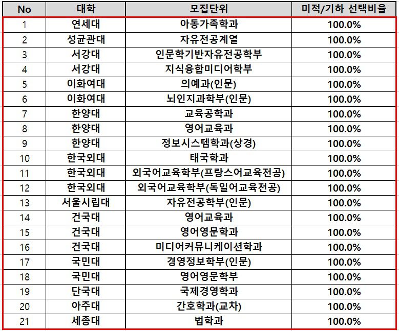 서강대 인문학기반자유전공학부(100%), 지식융합미디어학부(100%), 경제학과(89.7%), 영문학부(85.2%)도 마찬가지다. 한양대 교육공학과와 영어교육과도 각각 100%가 미적·기하 선택자였다.