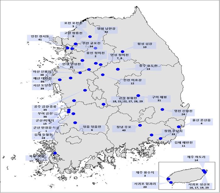 야생조류 고병원성 조류인플루엔자(AI) 발생현황 지도('24~'25년 동절기). 자료 출처 : 환경부 |