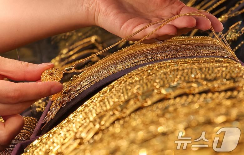 (서울=뉴스1) 김성진 기자 = 이스라엘의 이란 핵시설 공습과 이에 대한 이란의 미사일 보복이 이어지면서 금값이 사상 최고치에 근접했다. 뉴욕 상업거래소에서 금 선물 근월물 가격은 13일 오후 3시 18분 기준 온스당 3천457달러로 전장보다 1.6% 올라 지난 4월 22일 이후 약 2개월 만에 사상 최고치였던 온스당 3,500달러 돌파를 다시 눈앞에 뒀다. 15일 서울 종로구 골드팡 종로직영점에서 관계자가 금 제품을 들어 보이고 있다. 2025.6.15/뉴스1