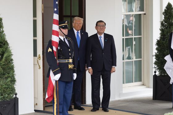 지난 2월 미국 워싱턴DC를 방문한 이시바 시게루 일본 총리가 도널드 트럼프 미국 대통령과 백악관에서 기념 촬영을 하고 있다. 신화통신=연합뉴스