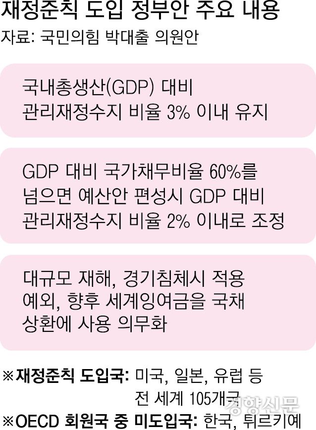 재정준칙이란 국가의 재정 건전성을 유지하기 위해 국가채무 비율 등을 법으로 관리하는 제도다. 2015년 박근혜 정부 때부터 논의가 시작됐지만 문재인 정부에서도 코로나19 대유행으로 우선순위에서 밀렸다. ‘건전 재정’ 기조를 내세운 윤석열 정부에선 박대출 국민의힘 의원이 대표 발의한 ‘재정준칙 도입법’(국가재정법 개정안)이 사실상 정부안으로도 나왔지만 국회에 계류 중이다.