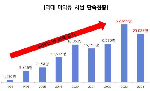 특히 10대 마약사범은 2005년 연간 30명 수준이었으나 2023년에는 역대 최인 1477명까지 늘어났다가 지난해에는 649명으로 56.1%, 절반 이상 대폭 줄었다.