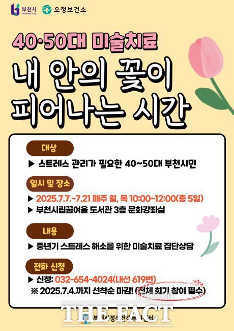 [더팩트|부천=김동선 기자] 경기 부천시는 부천시정신건강복지센터와 함께 오는 7월 7일부터 21일까지 부천시립꿈여울도서관에서 40~50대 중년기 시민을 대상으로 미술치료 집단상담 프로그램 '내 안의 꽃이 피어나는 시간'을 운영한다고 15일 밝혔다.