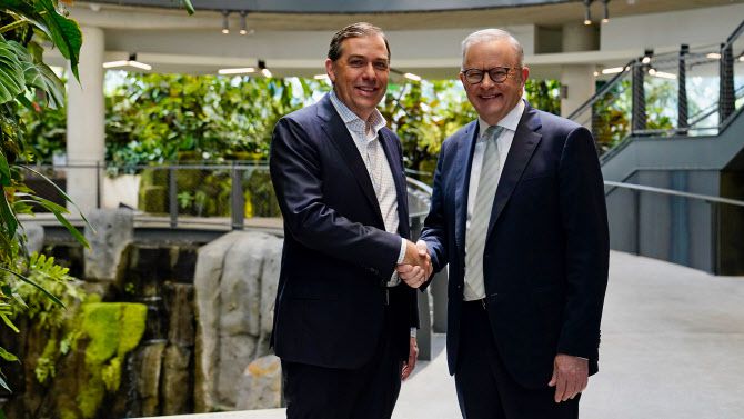 2025년 6월 14일(토) 시애틀 아마존 스피어에서 회동을 마친 후 앤서니 알바니지 호주 총리(오른쪽)와 맷 가먼 아마존 웹서비스 CEO(왼쪽)가 악수하고 있다. 사진=아마존 홈페이지 |