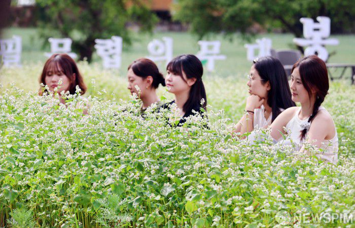 [서울=뉴스핌] 양윤모 기자 = 15일 휴일을 맞아 강원도 평창 봉평에서 열린 '제3회 봉평 오얏나무숲 메밀꽃축제'를 찾은 방문객들이 초여름 메밀꽃밭에서 멍때리기 체험을 즐기고 있다.'봉평 메밀꽃이 피었습니다' 라는 주제로 열린 이번 축제는 메밀꽃밭 멍때리기, 메밀그림그리기, 메밀꽃밭 콘서트 등 다채로운 프로그램으로 방문객들에게 즐거움을 선사했다.축제 위원장인 봉평메밀에프앤비 영농조합법인 변찬수 대표는 "이번 축제를 통해 바쁜 현대인들에게 메밀꽃밭의 자연과 음악으로 여유로움을 제공하는 한편 봉평 지역 메밀 특산물을 널리 알리는데 힘쓰겠다"고 전했다. [사진=봉평메밀에프앤비영농조합] 2025.06.15 yym58@newspim.com