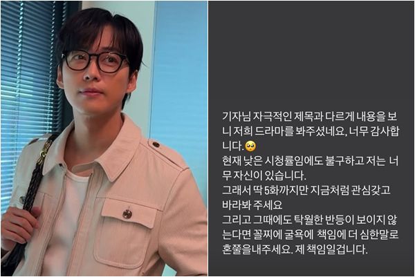 이어 “현재 낮은 시청률이지만 저는 자신 있다. 딱 5화까지만 지금처럼 관심 갖고 지켜봐 달라”라며 “그때도 반등이 없고 변화가 없다면 꼴찌, 굴욕, 책임에 더 심한 말로 혼쭐내달라. 제 책임일 것”이라고 당부했다.
