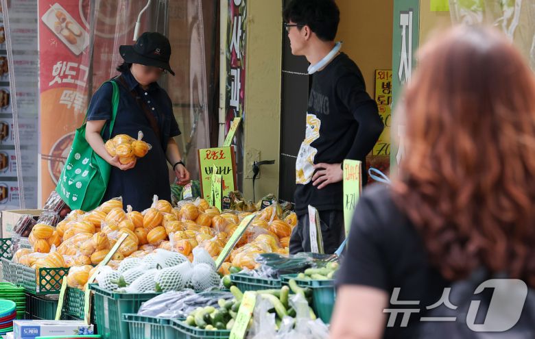(서울=뉴스1) 김성진 기자 = 우리나라의 실질 구매력을 고려한 먹거리 물가가 경제협력개발기구(OECD) 국가 중 두 번째로 높은 수준인 것으로 조사됐다. 15일 OECD의 구매력 평가(PPP:Purchasing Power Parity)를 고려한 물가 수준 통계에 따르면, 한국의 식료품 및 비주류 음료 가격 수준은 2023년 기준 147로 OECD 평균(100)보다 47% 높았다. 이는 OECD 38개국 중 스위스(163)에 이어 두 번째로 높은 수준이다. 사진은 이날 서울 종로구 한 식료품 매장에서 시민이 참외를 구매하고 있다. 2025.6.15/뉴스1