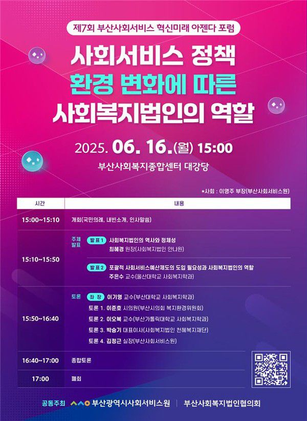 유규원 부산사회서비스원장은 "이번 포럼을 통해 지역 사회복지법인의 기능과 공공성과 전문성을 재조명하고, 보다 지속 가능한 사회서비스 정책 설계를 위한 토대가 마련되길 기대한다"고 밝혔다.