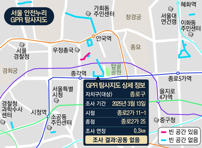 서울시는 지난 3월 강동구 지반침하 이후 서울안전누리에 게시글 형태로 GPR 특별점검 결과를 공개해왔다. 서울시는 “지역 정보를 보다 편리하게 확인할 수 있도록 GPR 탐사지도를 새롭게 추가하고 지도에서 GPR 탐사 정보를 바로 확인할 수 있도록 개선했다”며 “지도를 통해 누구나 관심지역의 GPR 탐사 결과와 지하 공동 발생 여부를 직관적으로 확인할 수 있게 개선한 것이 핵심”이라고 설명했다.