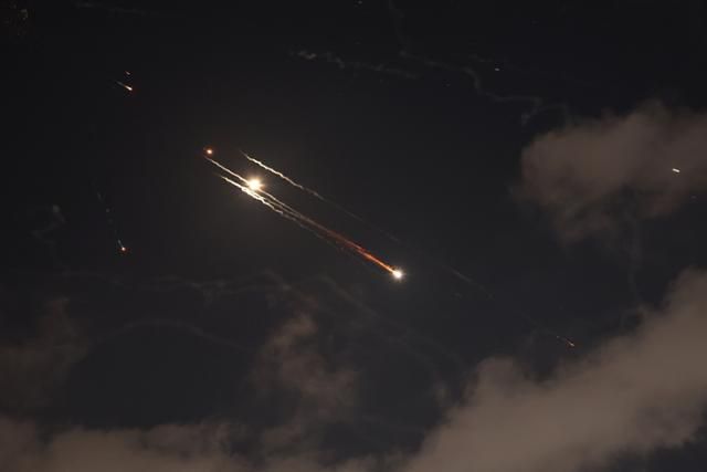 이스라엘 미사일 방어 시스템인 '아이언돔'이 15일 텔아비브 상공에서 이란이 발사한 탄도미사일을 요격하고 있다. 텔아비브=EPA 연합뉴스 |