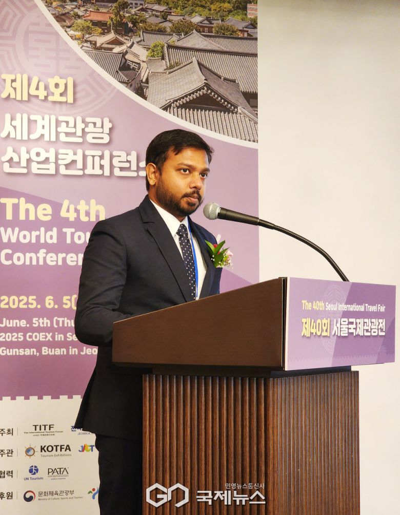 (서울=국제뉴스) 유지현 기자 = 5일 서울 삼성동 그랜드 인터컨티넨탈 서울 파르나스에서 열린 제4회 세계관광산업컨퍼런스(WTIC ; World Tourism Industry Conference 2025) 축사를 하는 아룬 헤마찬드라(Arun Hemachandra) 차스리랑카 외교 및 외국인 고용부 차관.