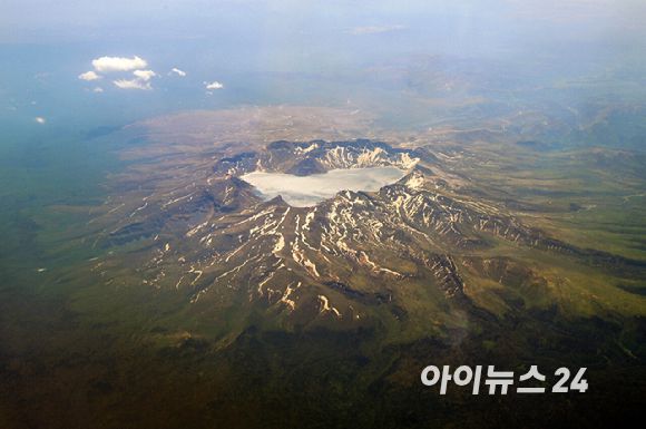 13일 오전 연길공항에서 인천공항으로 가는 비행기 탑승 중 창가에서 바라본 백두산의 모습. [사진=정소희 기자] |