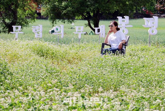 [이데일리 김태형 기자] 15일 휴일을 맞아 강원도 평창 봉평에서 열린 제3회 봉평 오얏나무숲 메밀꽃축제를 찾은 방문객들이 초여름 메밀꽃밭에서 멍때리기 체험을 즐기고 있다.