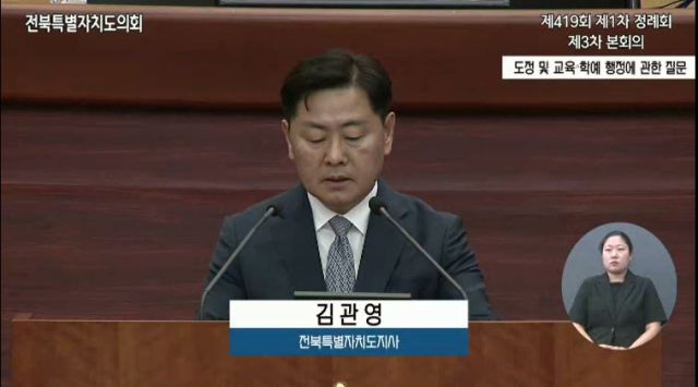 ▲전북도의회 정례회에서 답변하고 있는 김관영 전북도지사 ⓒ전북도의회 유튜브 캡처