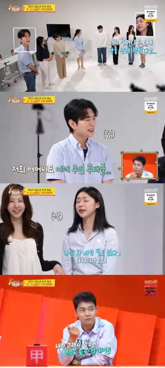 홍주연은 "할머니가 요새 진웅 선배가 괜찮다고 하더라. 나이 차는 필요없다고 하시더라"라고 했다. 김진웅도 어머니께서 홍주연을 괜찮다고 얘기한다고 말했다.