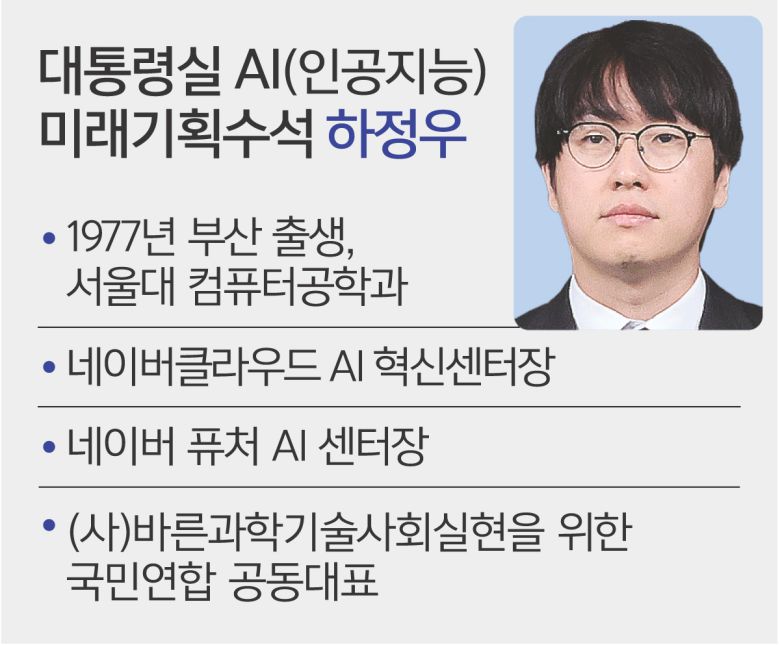 하 수석은 2020년 네이버 AI 랩 책임리더 겸 소장을 지냈고, 현재 네이버클라우드 AI 이노베이션 센터장과 네이버 퓨처 AI 센터장을 맡고 있다. 그는 윤석열 전 대통령 직속 디지털플랫폼정부위원회에서 2년간 활동하고, 2023년부터 금융감독원·과학기술정보통신부·산업통상자원부에서 자문위원 등을 맡는 등 정치권과도 활발히 교류해왔다. 윤 전 대통령 탄핵 이후 더불어민주당 정책 소통 플랫폼 ‘모두의질문Q’가 주최한 이재명 당시 당대표와의 대담에 참여하기도 했다.