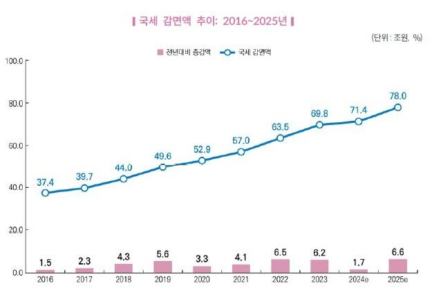올해 비과세와 감면 등으로 깎아주는 세금이 78조 원으로 역대 최대 규모에 달할 전망이다. 세수결손에도 깎아주는 세금이 늘어나며 국세감면율은 3년 연속 법정한도를 초과할 것으로 보인다. 국회 예산정책처 2025 대한민국 조세. |