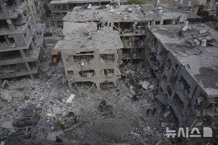 [AP/뉴시스] 14일 야간에 이란 탄도 미사일 공격을 받은 이스라엘 북부 바트 얌의 아파트 현장. 15일 아침 구조대가 나와 잔해를 살피고 있다. 6명이 죽고 여러 명이 깔려 있다. |