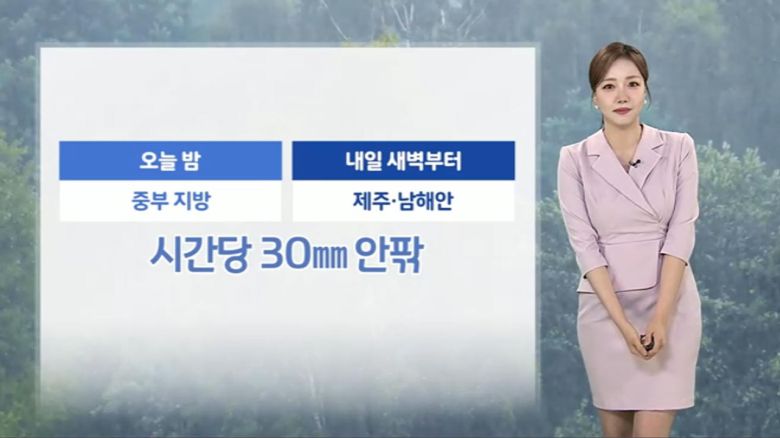 특히, 오늘 밤부터는 중부 지방에, 내일 새벽부터는 제주와 남해안을 중심으로 시간당 30mm 안팎의 강한 비가 집중되겠고, 곳에 따라 바람도 강하게 불겠습니다.