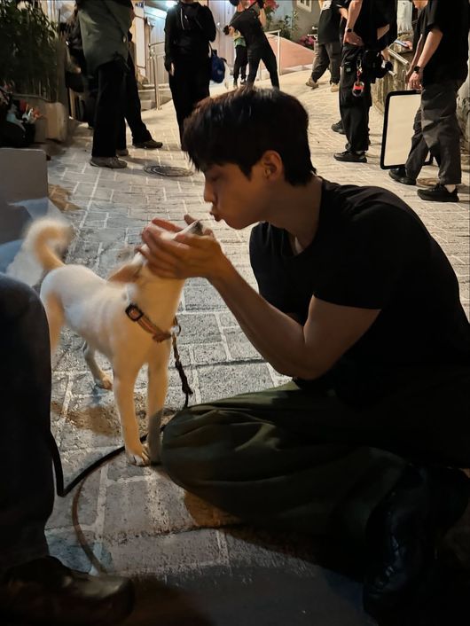 박보검, 촬영 현장서 '잘생김' 대방출…”팔근육 자랑하며 강아지와 뽀뽀”
