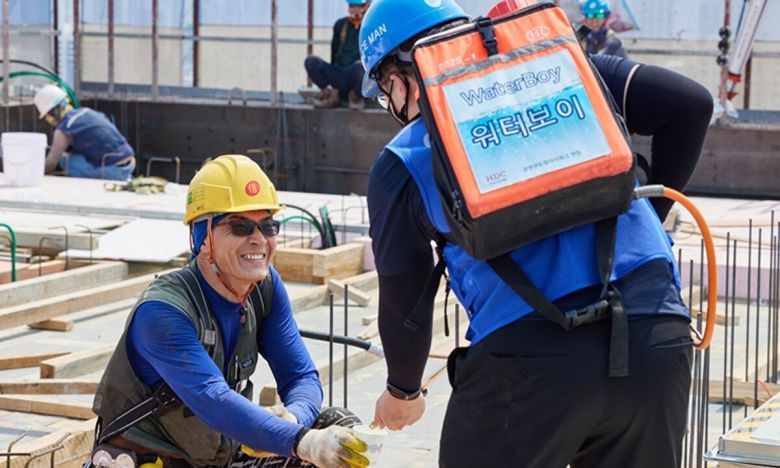 12일 HDC현대산업개발의 한 건설현장에서 근로자 온열질환 예방을 위한 ‘HDC 고드름 캠페인’의 일환으로 작업자에게 식수를 전달하고 있는 모습. HDC현대산업개발 제공