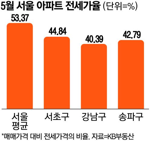 15일 KB부동산에 따르면 5월 강남구 아파트의 전세가율은 40.39%를 기록했다. 서초구는 44.84%, 송파구는 42.79%를 기록했는데 3구 모두 KB부동산이 구별 통계를 집계하기 시작한 2013년 4월 이래로 가장 낲은 수치다. 용산구의 전세가율도 42.97%로 전체 25개구 중에서 3번째로 낮았다.