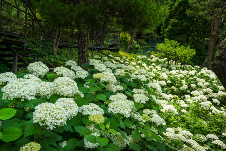 푸른 잎사귀를 포근히 감싸고 있는 꽃잎이 예술인 ‘산수국’, 나무를 형성하여 강인하면서도 여린 순백의 매력을 뽐내는 ‘목수국’ 소복하고 자그마한 눈사람이 떠오르는 ‘미국수국’, 조밀한 꽃들이 모여 한 송이 부케와 같은 ‘큰잎수국’ 등 다채롭게 푸른빛의 신비로움을 자아내는 수국들이 저마다의 아름다움을 뽐내어 여름 여행의 인생 사진을 남기기에 그만이다.