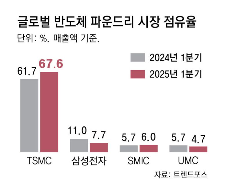 글로벌 파운드리 시장은 중국 최대 파운드리(위탁 생산) 업체 SMIC의 부상으로 경쟁구도 재편이 가속화되고 있다. 시장조사업체 트렌드포스에 따르면 3등 SMIC의 올 1분기(1∼3월) 점유율은 6.0%로 2등 삼성전자(7.7%)를 턱밑까지 쫓아왔다. 지난해 동기만 해도 양사 격차는 5.3%포인트였는데 1.7%포인트로 좁혀졌다. 1등 TSMC의 점유율은 67.6%다. 업계 관계자는 “SMIC가 TSMC와는 여전히 격차가 압도적으로 크지만 5나노 상용화에 이어 3나노 진입까지 나선 것 자체가 위협적”이라며 “한국도 더 이상 따라잡히지 않기 위한 기술 고도화와 정부 지원책이 시급하다”고 말했다.