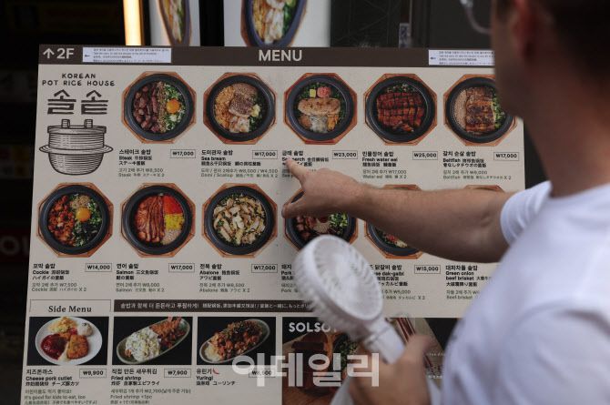 지난 16일 오후 서울 중구 명동에서 한 관광객이 음식 안내판을 살펴보고 있다.(사진=이데일리 노진환 기자)