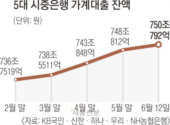15일 은행권에 따르면 KB국민·신한·하나·우리·NH농협은행 등 5대 시중은행의 가계대출 잔액은 지난 12일 기준 750조 792억원으로 지난달 말보다 1조 9980억원 증가했다. 일평균 가계대출 증가 규모는 지난 3월 580억원 수준이었으나 4월 1511억원, 지난달 1612억원으로 불어난 데 이어 이달에는 1665억원으로 늘었다.