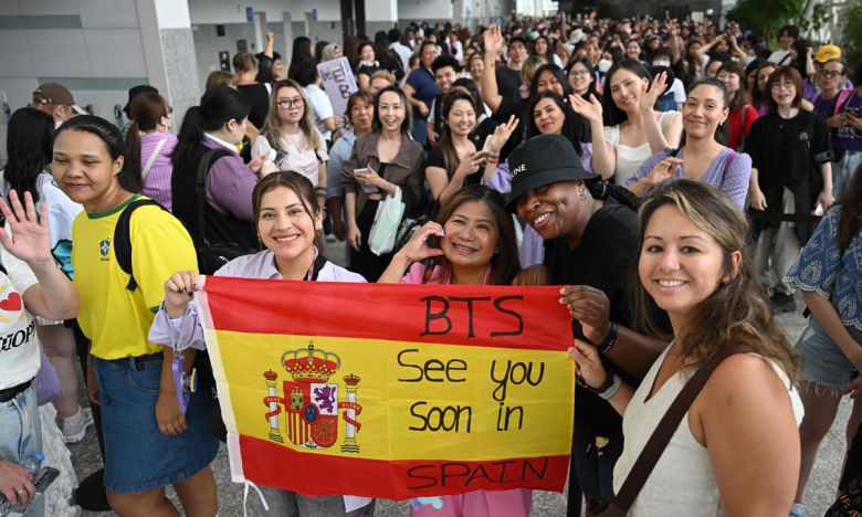 방탄소년단(BTS)의 데뷔 기념일에 맞춰 지난 13일 경기 고양시 킨텍스에서 열린 ‘2025 BTS 페스타’에서 입장하기 위해 줄을 선 세계 각국의 ‘아미’(BTS의 팬덤명)들이 포즈를 취하고 있다. 소속사 빅히트 뮤직에 따르면 이튿날까지 열린 오프라인 행사에 6만여명의 팬들이 행사장을 찾았다. AFP연합뉴스