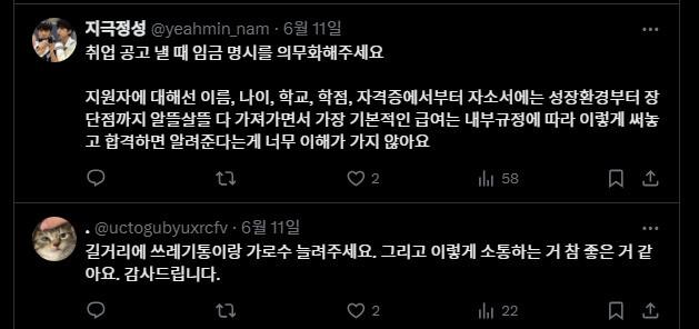 다양한 일터에서 전하는 노동권 보장에 대한 요구가 많다. 한 시민은 “아이티 업계에는 근무 시간 관리가 명확히 이루어지지 않는다. 수많은 중소·하청기업들은 주휴수당, 야근수당 한 번 없이 사람을 갈아가며 운영되고 있다”는 현실을 소개하며 “포괄임금제 폐지를 부탁드린다”고 호소했다. 또 다른 이는 “5인 미만 사업장에도 근로기준법 전면 적용, 특히 직장 내 괴롭힘에 관련된 조항의 전면 적용이 필요하다”고 적었다. 구직자로 추정되는 한 누리꾼은 “지원자에 대해선 이름, 나이, 학교, 학점, 자격증, 성장환경, 장단점까지 알뜰살뜰 다 가져가면서 (회사는) 가장 기본적인 급여를 ‘내부규정에 따라’라고 쓴다”며 “취업공고 낼 때 임금 명시를 의무화해달라”고 제안했다.