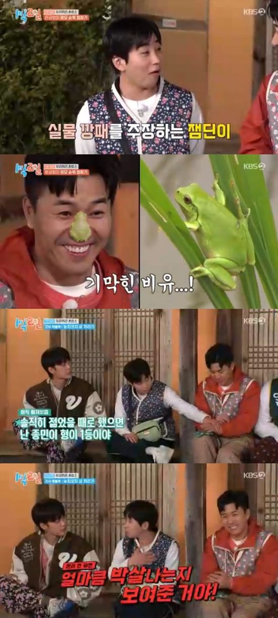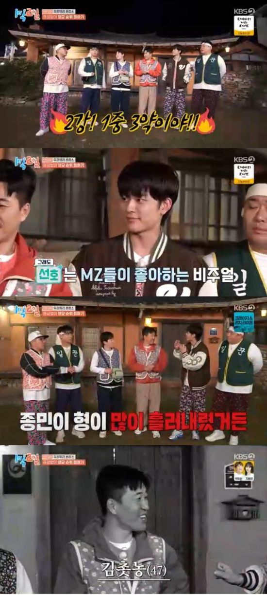 15일 방송된 KBS 2TV '1박 2일 시즌4'에서는 김종민, 문세윤, 조세호, 이준, 딘딘, 유선호가 외모순위를 결정하는 모습이 전파를 탔다.