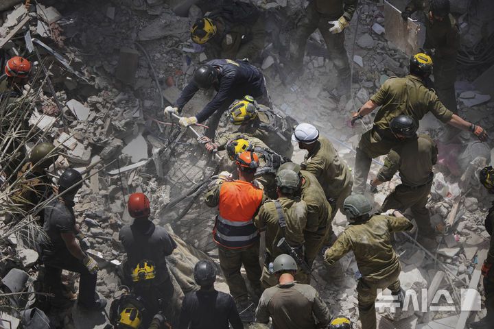 [바트얌=AP/뉴시스] 15일(현지 시간) 이스라엘 중부 바트얌에서 이스라엘 군인들이 이란의 미사일 공격으로 파괴된 주거 건물 잔해 속 생존자를 수색하고 있다. 2025.06.16.