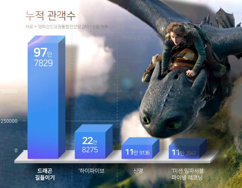 16일 영화관입장권통합전산망에 따르면 '드래곤 길들이기'는 지난 13일부터 전날까지 사츨간 31만8967명을 불러모아 이 기간 관객수 1위에 올랐다. 이와 함께 지난 6일 개봉 이후 누적 관객수는 97만7829명으로 늘어나 100만 고지에 바짝 다가섰다.