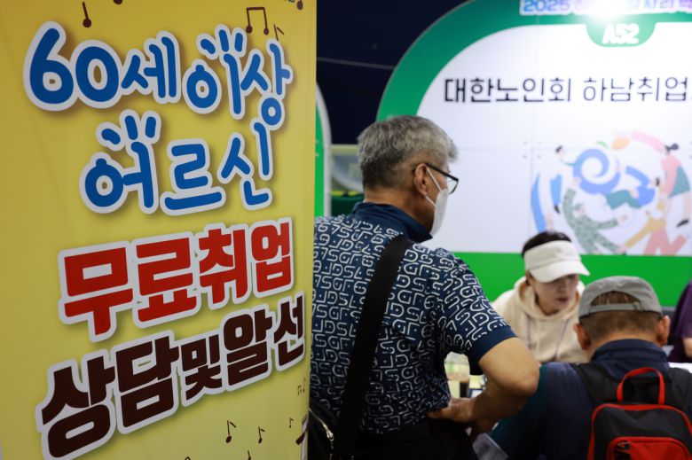 통계청이 ‘5월 고용동향’을 발표한 11일 경기도 하남종합운동장 제2체육관에서 열린 2025 하남시 일자리박람회에서 고령 구직자가 취업 상담을 받고 있다.  통계청이 발표한 ‘5월 고용동향’에 따르면 지난달 15세 이상 취업자는 2916만명으로, 작년 같은 달보다 24만5000명 증가했다. 특히 37만명 증가한 60세 이상 취업자(704만9000명)는 처음으로 700만명을 넘었다. [연합]