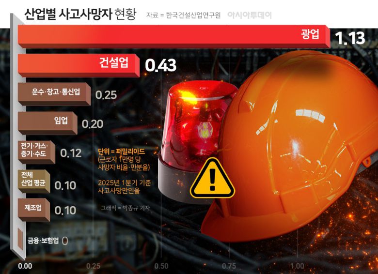 16일 한국건설산업연구원이 발표한 '2025년 1분기 건설업 사고사망자 현황' 자료에 따르면 1분기 건설업의 사고사망만인율(근로자 1만명당 사망자 비율)은 0.43퍼밀리아드(만분율, 이하 단위 모두 퍼밀리아드)였다.