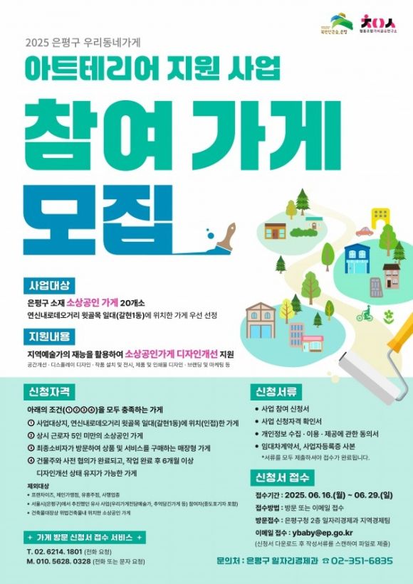 서울 은평구는 오는 29일까지 소상공인 가게의 인테리어를 개선하는 ‘아트테리어 지원 사업’(포스터) 참여 가게를 모집한다고 16일 밝혔다.