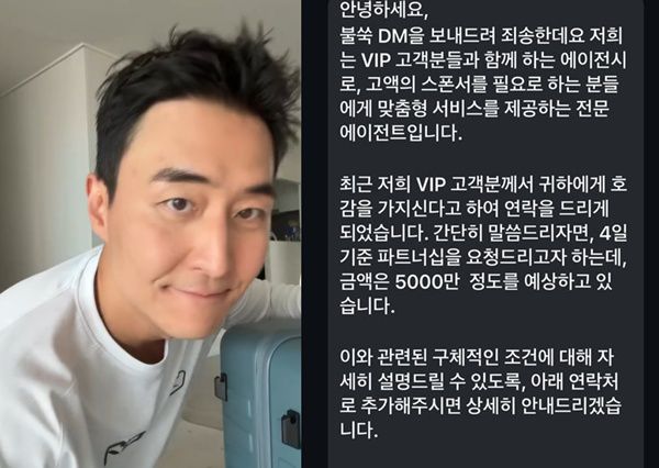 해당 메시지에는 "불쑥 DM을 보내 죄송한데 저희는 VIP 고객분들과 함께하는 에이전시로 고액의 스폰서를 필요로 하는 분들에게 맞춤형 서비스를 제공하는 전문 에이전트"라는 내용이 담겼다.