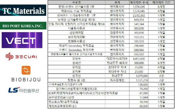 [아이뉴스24 김현동 기자] 지난달 코스닥 시장에 상장한 TC머티리얼즈, 바이오포트코리아, 바이오비쥬의 벤처투자자 주식과 전문투자자 주식이 1개월 만에 매물로 나올 전망이다. 비투엔과 LS마린솔루션은 투자조합과 최대주주를 상대로 진행한 3자배정 유상증자 신주가 1년 만에 보호예수에서 해제돼 잠재 매물로 나온다.