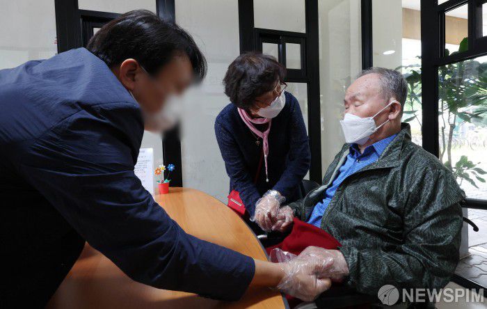 [서울=뉴스핌] 사진공동취재단 = 요양병원 등 감염취약시설의 대면 접촉 면회가 다시 가능해진 4일 오후 서울 마포구 시립서부노인전문요양센터에서 입소자와 가족이 면회를 하고 있다. 2022.10.04 photo@newspim.com