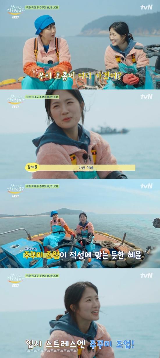 출연진들이 주꾸미 수확에 나섰다. 김혜윤은 "저 배 타고 뭐 잡으러 가는 거 처음이다"라며 들뜬 마음을 밝혔다. 이에 임지연이 "오늘 하고 다시는 안 하고 싶어질 거다"라고 농담을 건넸다. 김혜윤이 "저 집 간다고 울면 어떡하냐. 지금 두 분 완전히 울상에 한숨이다. 한숨 열 번째다. 무섭다"라며 임지연과 이재욱을 걱정했다.