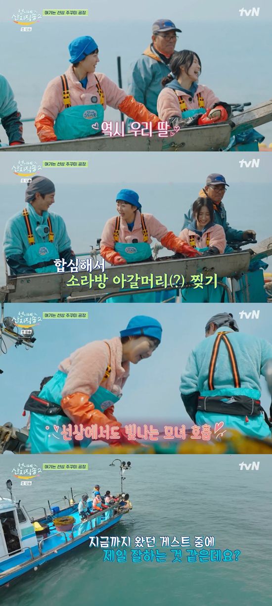 김혜윤이 범상치 않은 주꾸미 수확 실력을 뽐냈다. 염정아는 "역시 우리 딸. 얘 아주 기계다"라며 김혜윤을 칭찬했다. 김혜윤은 "선배님이랑 호흡이 잘 맞는 것 같다. 선배님이랑 내가 못 하는 거 재욱이가 하면 된다"라며 뿌듯해했다.