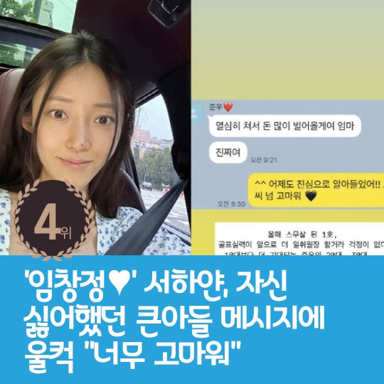 4위 : '임창정♥' 서하얀, 자신 싫어했던 큰아들 메시지에 울컥 "너무 고마워"