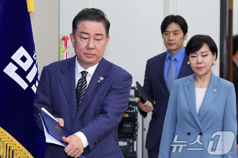 (서울=뉴스1) 안은나 기자 = 김병기 더불어민주당 대표 직무대행 겸 원내대표(왼쪽부터), 한준호, 전현희 최고위원이 16일 오전 서울 여의도 국회에서 열린 최고위원회의에 입장하고 있다. 2025.6.16/뉴스1