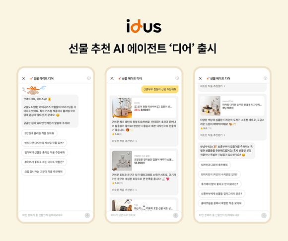 디어는 대규모 언어 모델(LLM) 기반 대화형 상품 추천 AI 에이전트다. 아이디어스 고객이 '선물추천' 탭과 '검색결과' 화면의 디어 대화창에서 '30대 여성 생일 선물 골라줘', '집들이 선물 추천'처럼 질문을 챗봇에 남기면 디어가 선물 대상과 상황을 파악한 뒤 아이디어스에 등록된 작품 상세 정보와 고객 주문 후기 등을 종합 분석해 가장 적합한 선물을 추천해준다.