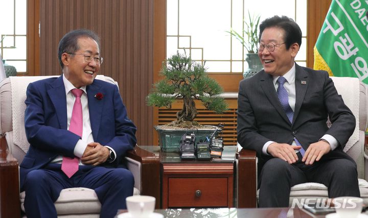 [대구=뉴시스] 이무열 기자 = 이재명 더불어민주당 대표가 10일 오후 대구시청 산격청사를 찾아 홍준표 대구시장과 면담하고 있다. 2023.05.10. lmy@newsis.com |