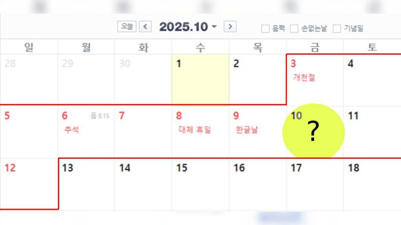 오는 10월, 개천절부터 한글날까지 이어지는 연휴에 10일(금요일)이 임시공휴일로 지정될 경우 총 10일간의 '초장기 황금연휴'가 가능해지면서 국민적 관심이 집중되고 있다.